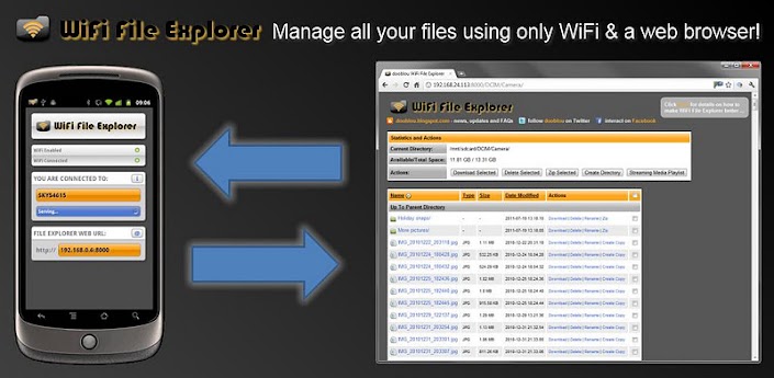 * Featured on Life Hacker and recommended by Motorola! The ORIGINAL, best, steadiest and most popular WiFi file transfer app with now over 1 million users across all app stores worldwide! So don’t waste money by using poor imitation WiFi file transfer apps with similar names ... use the professional, best supported, most feature rich one – WiFi File Explorer *Browse, transfer, download, upload, delete, copy, rename, stream and manage files that are on your Android device, using a web browser via a WiFi connection.